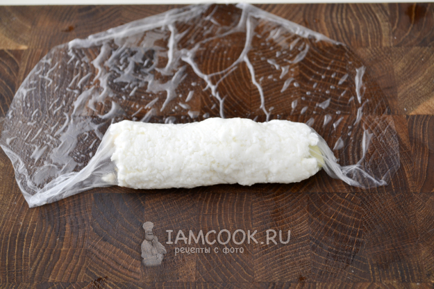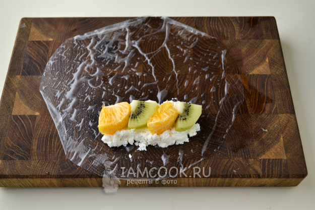 Переложите рисовую бумагу на доску или тарелку, смоченную водой. На край рисовой бумаги положите творожную массу, по паре кусочков мандарина, киви.