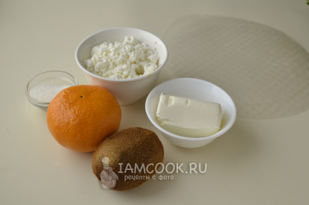 Соберите продукты для приготовления сладких спринг-роллов. Творог лучше взять не влажный. Мандарин и киви вымойте и обсушите.