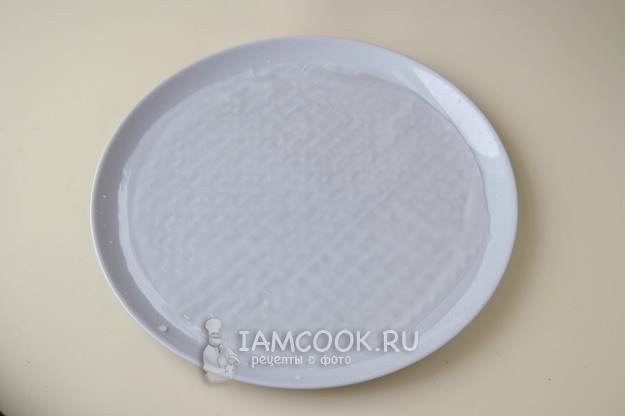 В плоскую тарелку налейте холодную воду, опустите в воду рисовую бумагу на 2-3 секунды, не дольше.