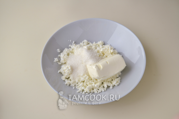 В миску положите творог, сахар и творожный сыр. По желанию можно добавить щепотку ванилина.