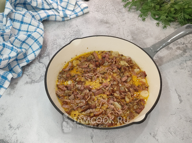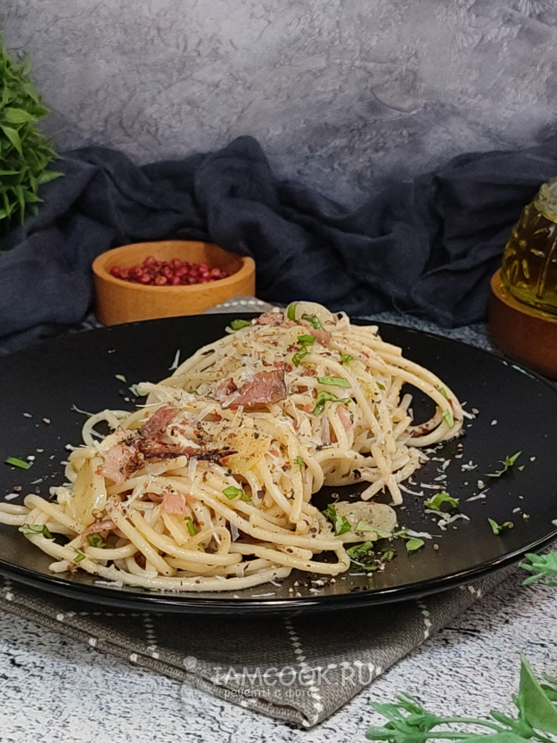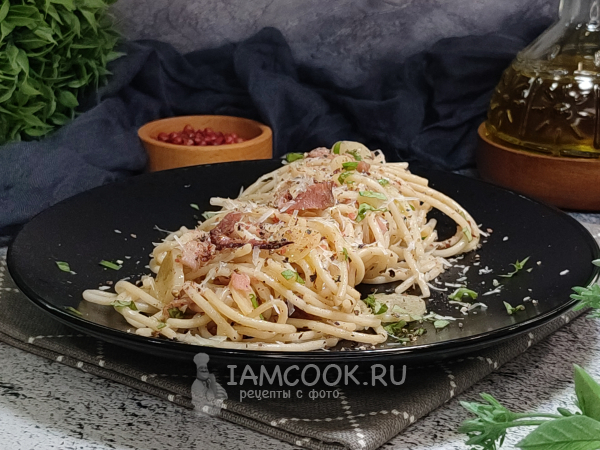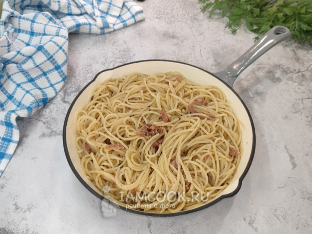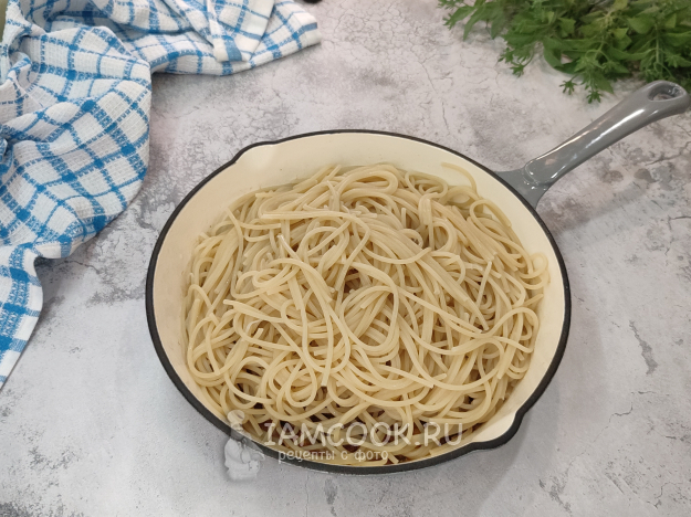 Пасту отварите согласно инструкции на упаковке до состояния аль-денте. Откиньте на дуршлаг, не промывая, добавьте в сковороду.