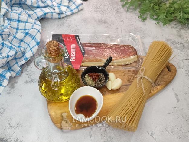 Соберите ингредиенты для приготовления пасты с прошутто. Самый долгий процесс - варка пасты, поэтому поставьте воду на плиту, посолите, пусть закипает.