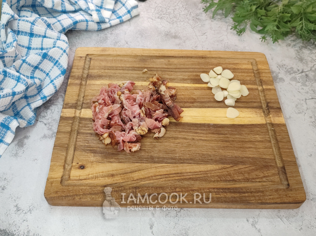 Чеснок нарежьте пластинками, прошутто - соломкой.