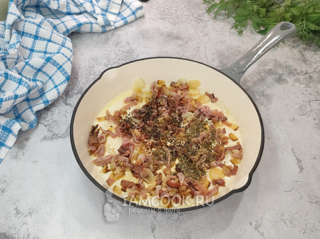Выложите прошутто, все специи, вустерский соус, перемешайте.