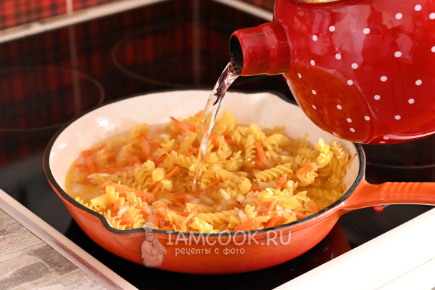 К обжаренным макаронам влейте кипяток. Воды берём примерно в 1,5 раза больше, чем сухих макарон. Точное количество воды зависит от качества макарон и их конфигурации. По моим наблюдениям, спиральки впитывают воды меньше, а перья - больше.