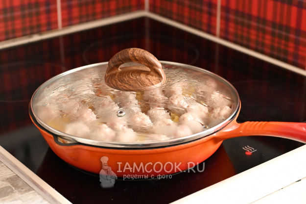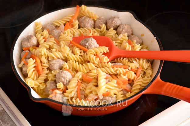 Накройте сковороду крышкой и на сильном огне готовьте макароны с фрикадельками 5-7 минут, чтобы фрикадельки "схватились". Если начнёте перемешивать сразу, то фрикадельки могут развалиться.