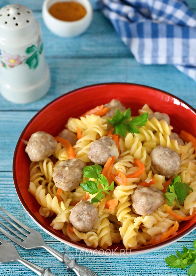 По вкусу посолите и добавьте любые специи (у меня готовая смесь специй для мяса). Соль рассчитывайте только на объём макарон, так как фрикадельки в своём составе обычно уже соль имеют.