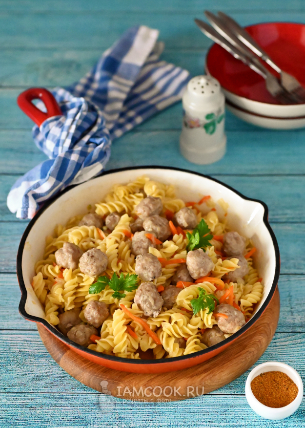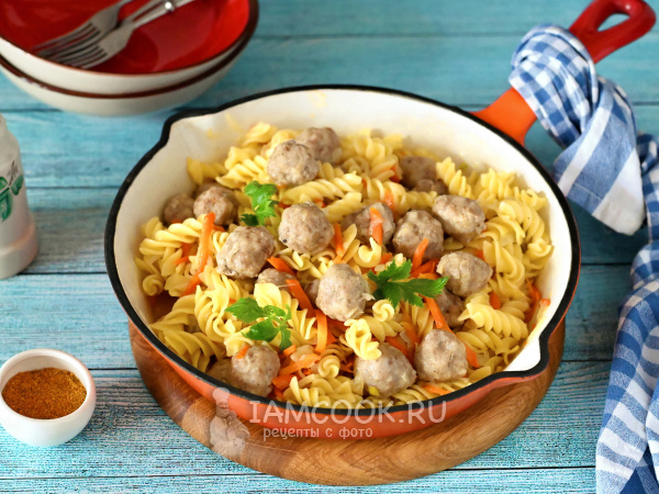 Макароны лучше брать короткие (спиральки, рожки, перья). Поскольку мы не будем предварительно отваривать макароны, то поместить в сковороду спагетти или букатини в сухом виде будет крайне затруднительно. И не стоит использовать вермишель, так как она готовится буквально несколько минут, а фрикадельки не успеют приготовиться за столь короткое время. Макароны используйте исключительно из твёрдых сортов пшеницы (группа А), так как иные виды макарон при таком способе приготовления могут повести себя непредсказуемо.