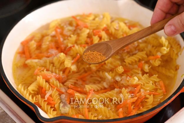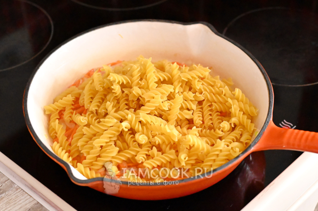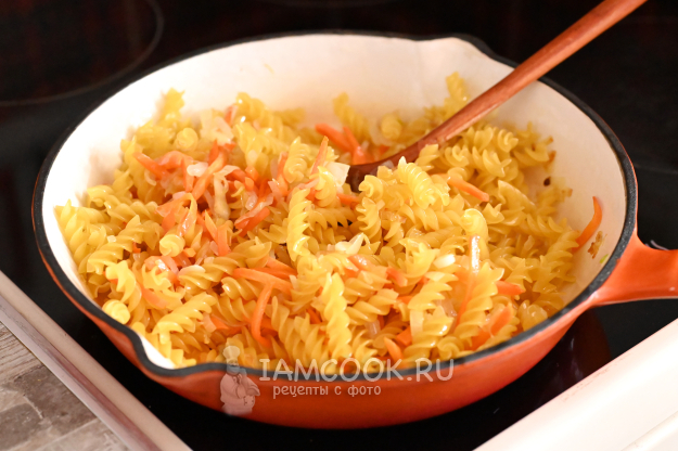 Помешивая, обжарьте их вместе с луком и морковью около 1 минуты. Обжаривание сухих макарон в масле не даст им слипнуться в процессе приготовления на сковороде в малом количестве воды.
