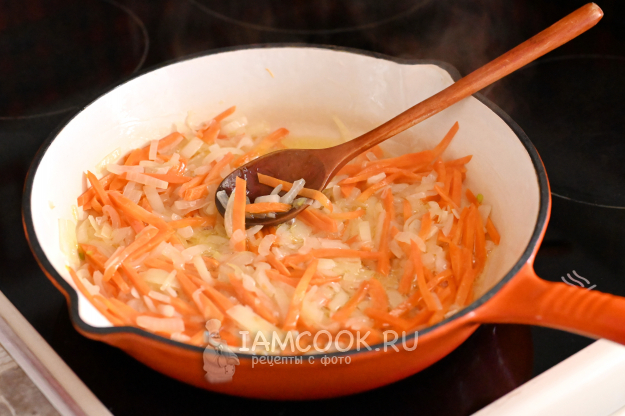 Разогрейте в сковороде растительное масло и обжарьте лук с морковкой до золотистого цвета на среднем огне.