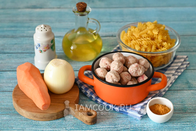 Соберите необходимые продукты и начнём готовить макароны с замороженными фрикадельками на сковороде.