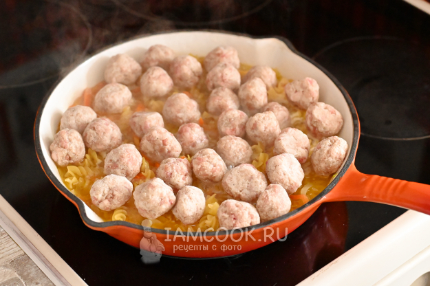 Поверх макарон выложите замороженные фрикадельки и пока их не тревожьте.