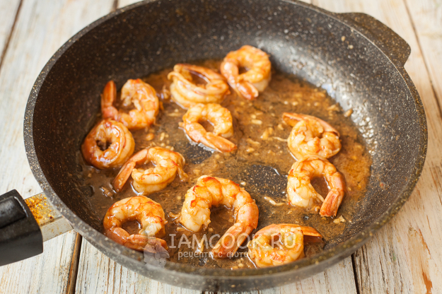 Вылейте маринад к лангустинам, уменьшите огонь и готовьте блюдо еще пару минут, постоянно помешивая. Постепенно соус загустеет и покроет лангустины.