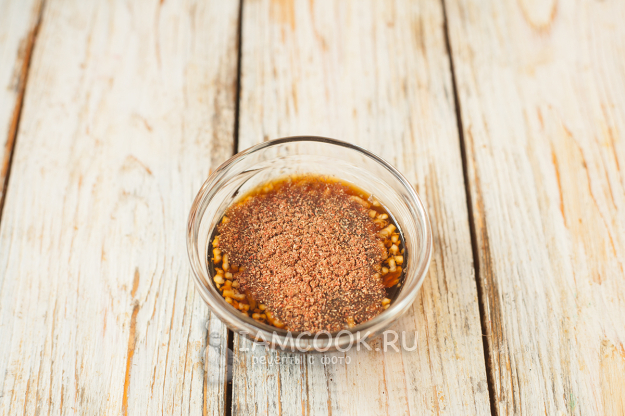 Приготовьте маринад: смешайте в глубокой емкости соевый соус, приправу для креветок и пропущенный через пресс чеснок. Все хорошо перемешайте.