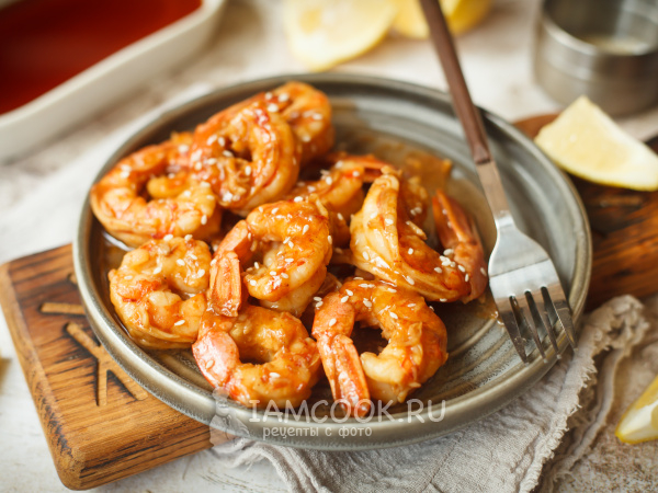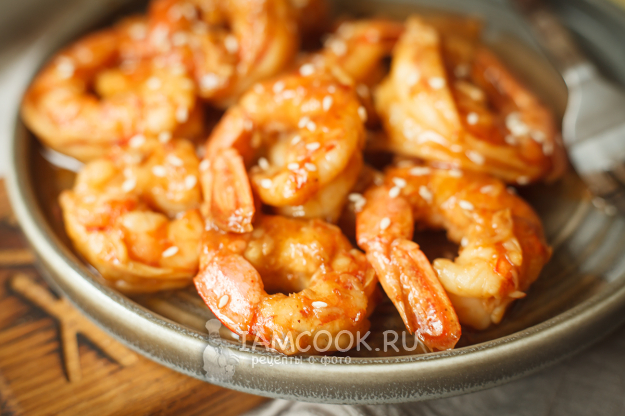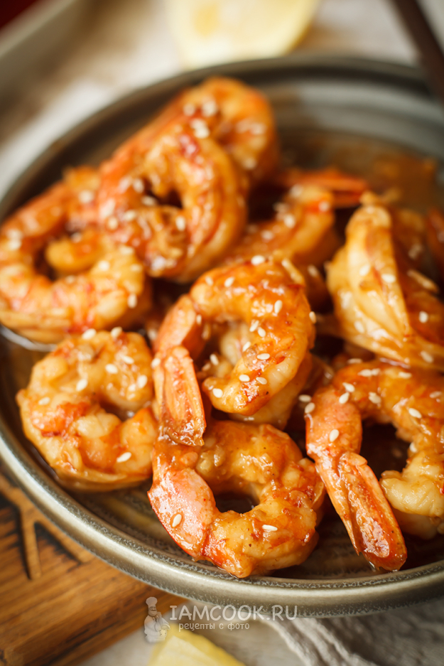 Готово! Можно переложить лангустины в соевом соусе на тарелку, полить остатками соуса из сковороды и посыпать кунжутом.