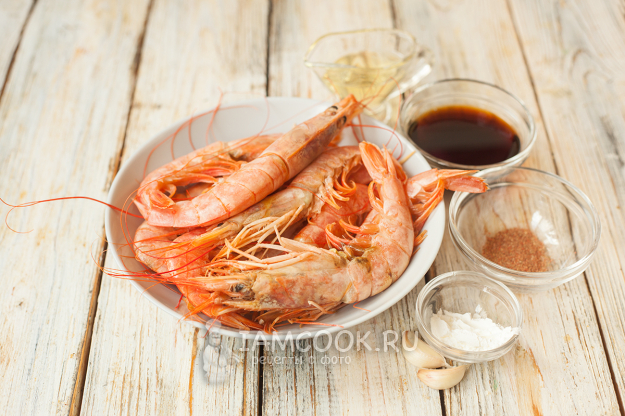 Вот такие продукты понадобятся, чтобы приготовить лангустины в соевом соусе на сковороде. Я взяла готовую приправу для креветок, в ее составе: кориандр, перец чили, черный и душистый перцы, лимонная цедра. Можно взять свои любимые специи и смешать их в произвольной пропорции. Крахмал лучше использовать кукурузный, у него, в отличие от картофельного, почти отсутствует характерный привкус. Свежий чеснок можно заменить сушеным.
