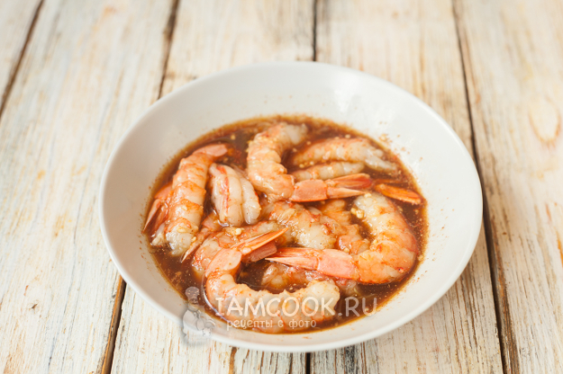 Погрузите креветки в маринад и оставьте мариноваться на 15 минут при комнатной температуре.