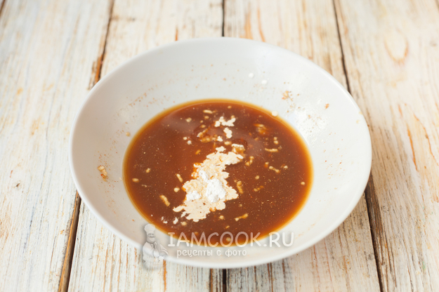 Добавьте в оставшийся маринад крахмал и тщательно перемешайте. По желанию его можно предварительно процедить через мелкое сито, чтобы удалить кусочки чеснока.