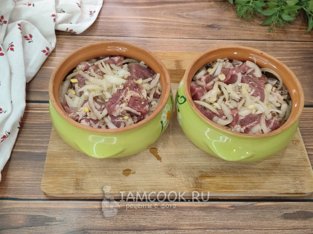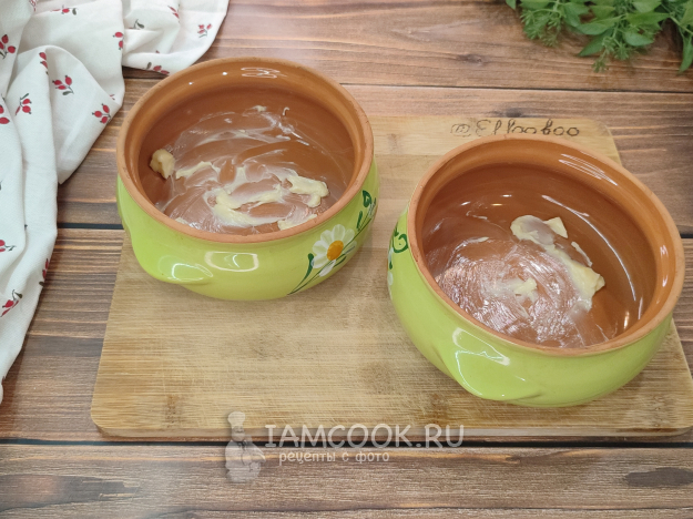 На дно горшочков кладем масло, не столько от пригорания, сколько для аромата).