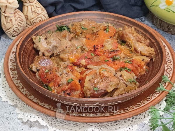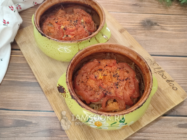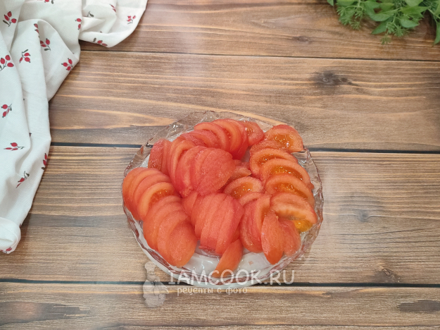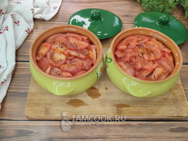 Сверху выкладываем томаты. Кислинка их как нельзя лучше сочетается с жирненьким мясом и тоже немного подмаринует его. А в приготовленном виде они превратятся практически в пюре. Помидоры можно слегка присолить, поперчить.
