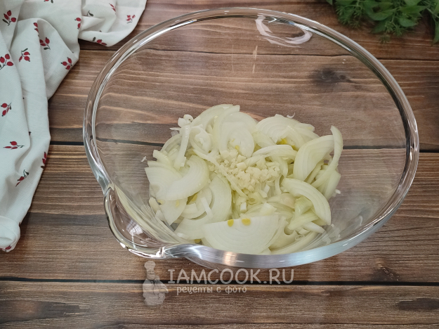 Лук нарежьте соломкой или кубиком, чеснок - помельче. Все складываем в глубокую миску.