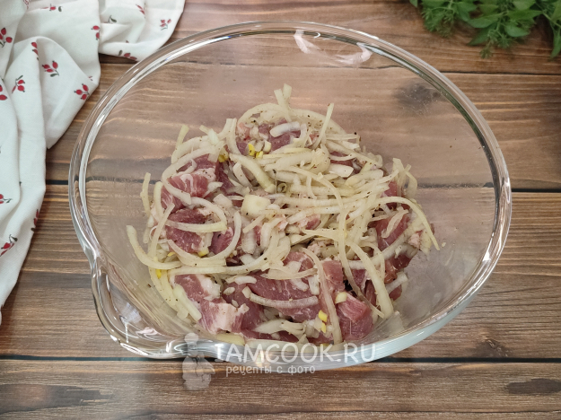 Хорошо и тщательно перемешиваем, стараясь посильнее давить на лук, он даст сок, который будет тоже подмариновывать мясо.