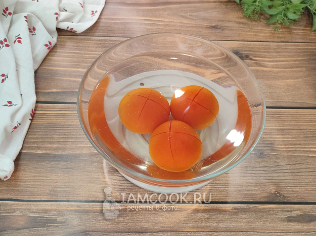 С томатов хочу снять кожицу (вы можете этого не делать, если она вам не мешает). Делаю на них крестообразные надрезы, заливаю кипятком на 3-4 минуты.