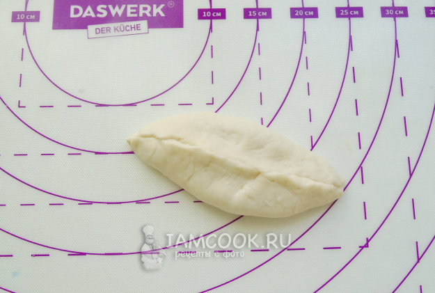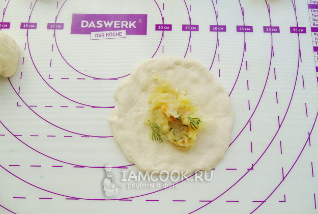 Каждый шарик раскатайте в лепешку и на середину выложите начинку.