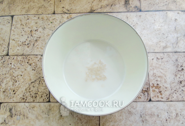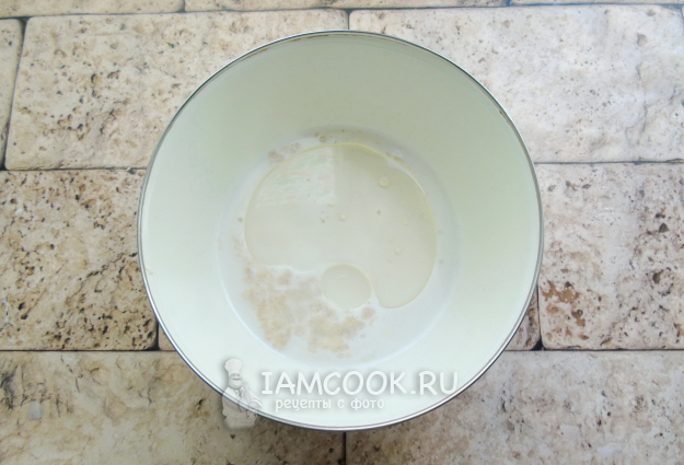 Налейте теплое молоко и насыпьте сахар. Дайте дрожжам активироваться.