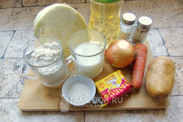 Соберите ингредиенты для приготовления жареных пирожков с капустой и картошкой.