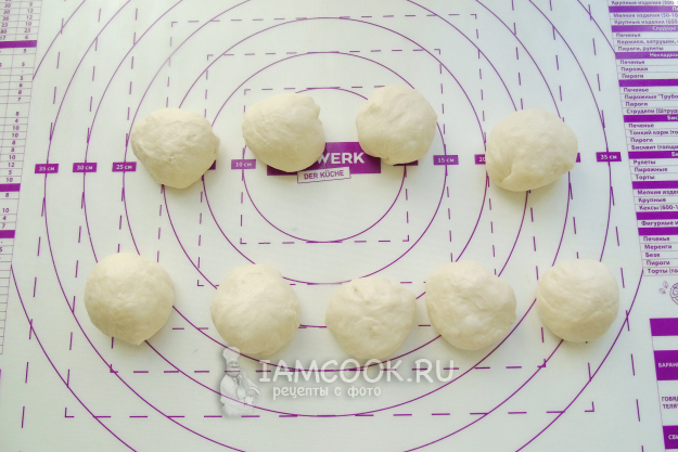Подошедшее тесто достаньте из миски и разделите на шарики весом приблизительно 50-60 граммов.
