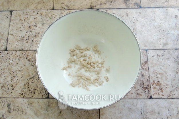 В миску накрошите свежие дрожжи. Сухих потребуется в 3 раза меньше.