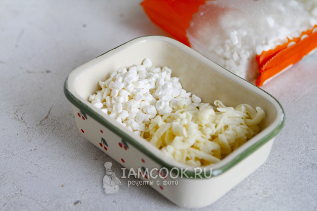 В форму для запекания перекладываем сыр и добавляем зерненый творог. Да-да, тот самый зерненый творог, который внешне ну очень напоминает зернышки кукурузы.
