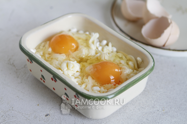 Перемешайте сыр с творогом и слегка посолите. Разбейте яйца.