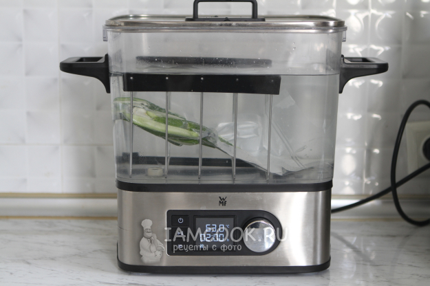 Емкость заполните водой. Выставьте температуру 63 градуса. Когда вода нагреется до нужной температуры, опустите пакет и готовьте 2 часа. Убедитесь, что пакет полностью погружен в воду. Если он будет всплывать, установите небольшой грузик.