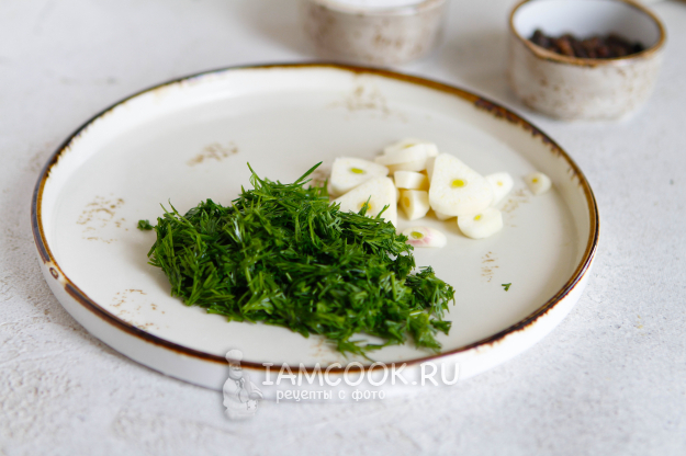Зелень замочите в прохладной воде на 5-10 минут. Затем промойте, обсушите и мелко нашинкуйте. Почистите чеснок и нарежьте его на слайсы.