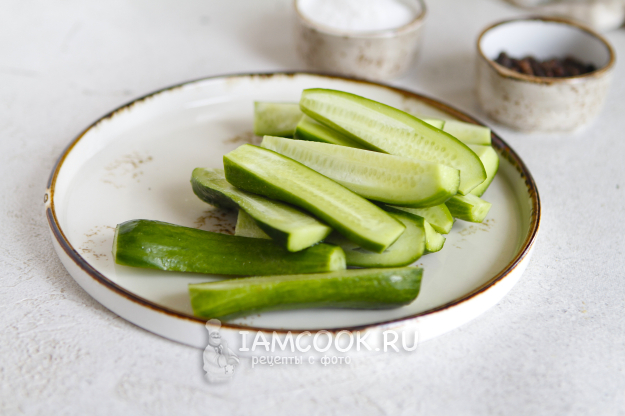 Срежьте кончики и разрежьте огурцы пополам.