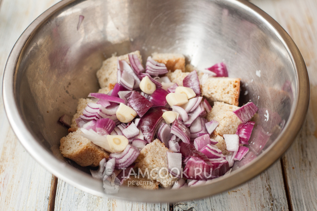 С размоченного хлеба слейте остатки жидкости. Очистите лук и чеснок, нарежьте кусками произвольной формы и добавьте в миску к хлебу.