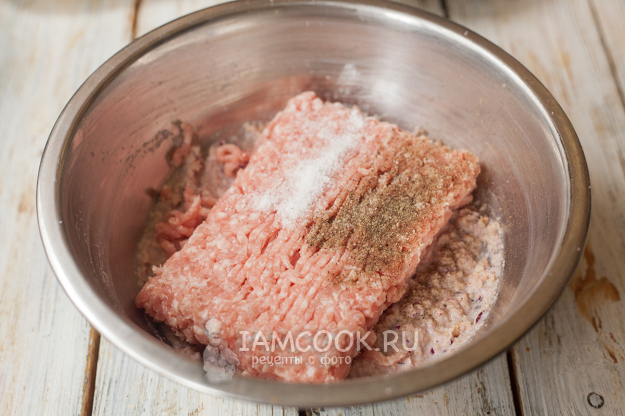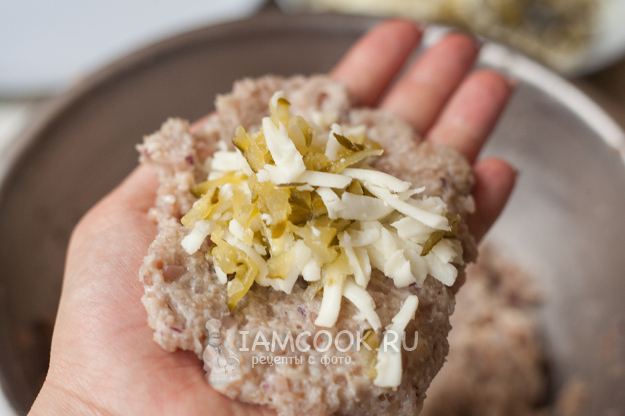 Возьмите в руку немного фарша, скатайте шарик, а потом расплющите в лепешку. По центру положите примерно 1 ст.л. начинки.