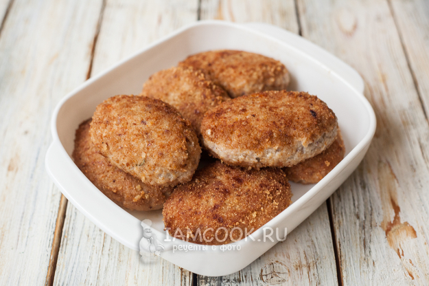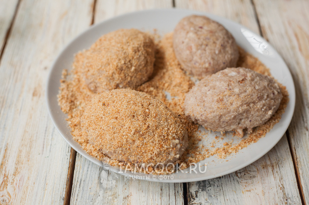 Обваляйте котлеты в панировочных сухарях со всех сторон, излишки панировки стряхните.