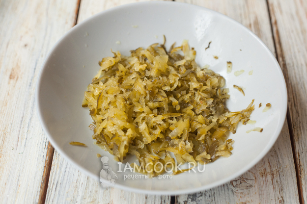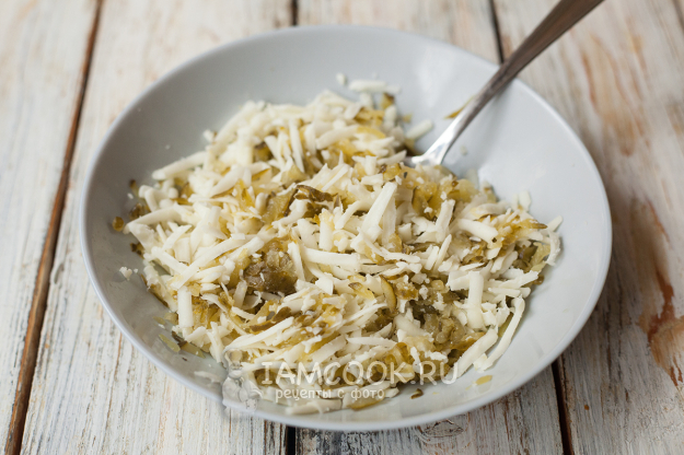 Тем временем можно приготовить начинку и остальные компоненты котлет. Соленые огурцы натрите на крупной терке и слегка отожмите от сока.