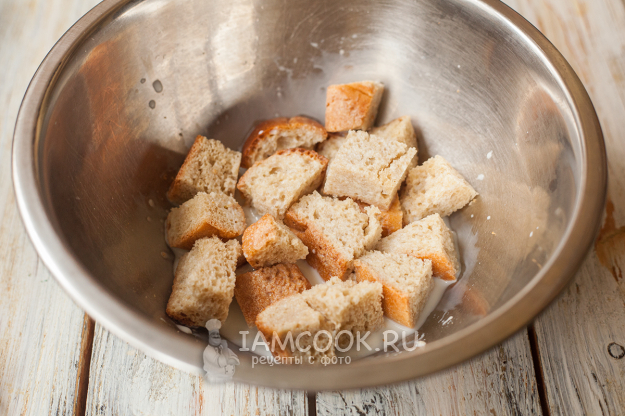 Хлеб для котлет лучше брать чуть подсохший, вчерашний или позавчерашний. Нарежьте его или поломайте руками на небольшие кусочки, корочки можно предварительно срезать. Переложите хлеб в небольшую миску и залейте молоком или питьевой водой, перемешайте и оставьте размачиваться на 15-20 минут.