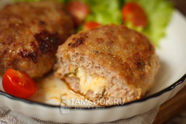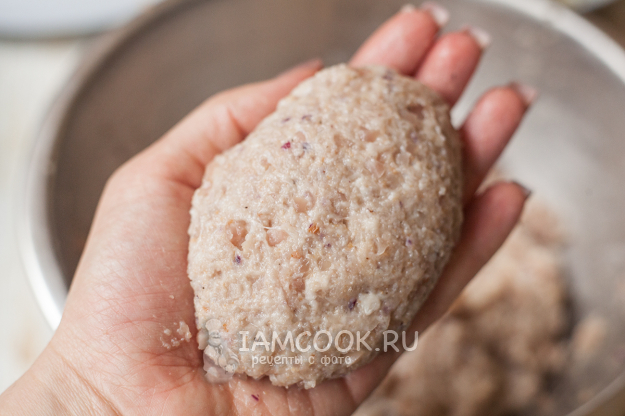 Загните края «лепешки» к центру, заворачивая начинку. Оставшееся отверстие закройте еще небольшой порцией фарша. Сформируйте продолговатую или круглую котлету. Проделайте то же самое с оставшимися продуктами.
