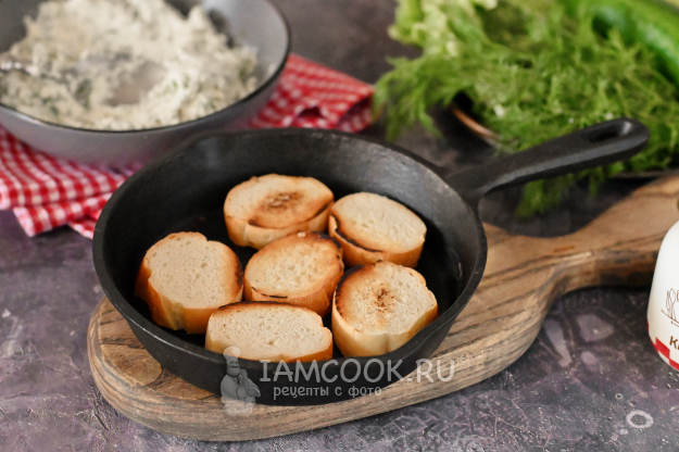 Багет нарежьте на ломтики толщиной около 1 сантиметра и слегка подрумяньте на сухой сковороде.