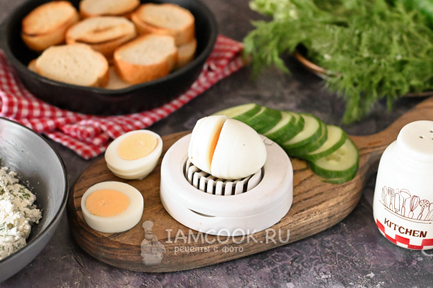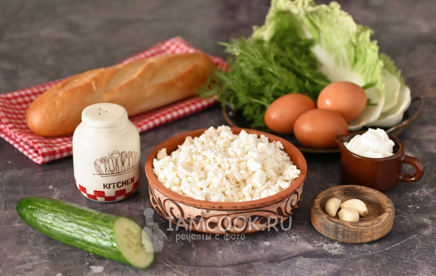 Соберите все необходимые продукты для приготовления бутербродов с творогом и яйцом.