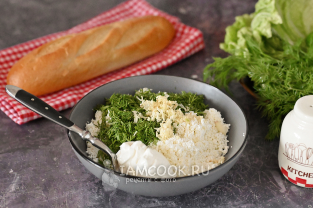 На ломтики багета положите небольшой кусочек салатного листа или пекинской капусты, как у меня. Поверх выложите немного творожной массы.