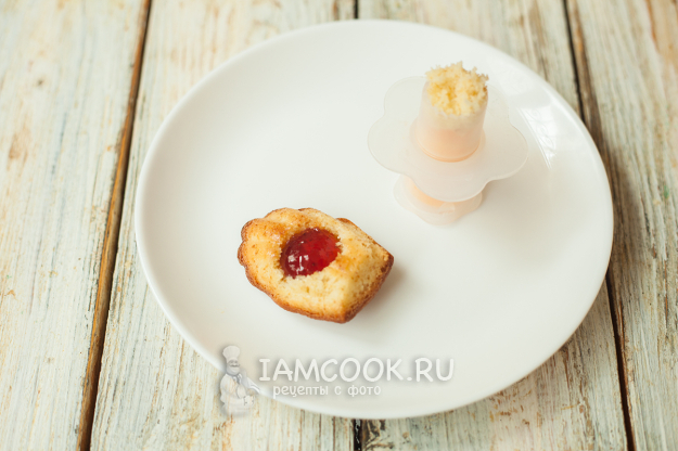При помощи плунжера для кексов (или аккуратно тонким ножом) сделайте несквозные отверстия с рельефной стороны «Мадлен». Заполните их густым джемом. В слишком сладкий джем можно добавить немного лимонного сока для равновесия (тем более у нас остался «лысый» лимон, его можно пустить в дело), т.к. тесто сладкое, шоколад сладкий, начинка должна быть с кислинкой. Начинку можно взять и другую - соленую карамель, шоколадный ганаш, лимонный или апельсиновый курд, вишневый конфитюр и пр. Главное условие - наполнитель не должен быть приторно-сладким.