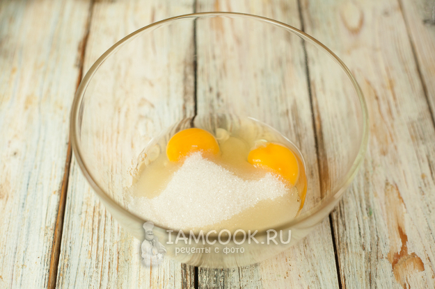 А пока в глубокую миску вбейте яйца, всыпьте сахар.
