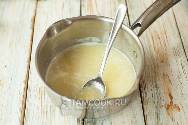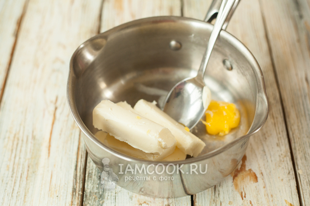 Приступим. Первым делом нужно растопить масло и мед. Масло можно использовать прямо из холодильника, просто нарежьте его небольшими кусочками, чтобы быстрее топилось, и переложите в сотейник. Туда же положите мед. Как видно, мед у меня густой, чуть кристаллизовавшийся, дополнительно его растапливать тоже не нужно.