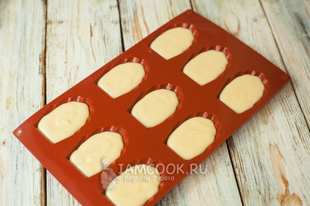 Распределите тесто по формам для «Мадлен». Традиционно они изготавливаются в виде небольших ракушек морского гребешка. Формы могут быть металлическими или силиконовыми. У меня 3 силиконовые формы, в каждой из которых по 9 ячеек. Если форма металлическая, ее нужно смазать маслом и присыпать мукой или панировочными сухарями. Силиконовую смазывать не обязательно. Заполняйте ячейки примерно наполовину. Удобнее всего распределять тесто при помощи кондитерского мешка, ложкой так аккуратно разлить не получится.